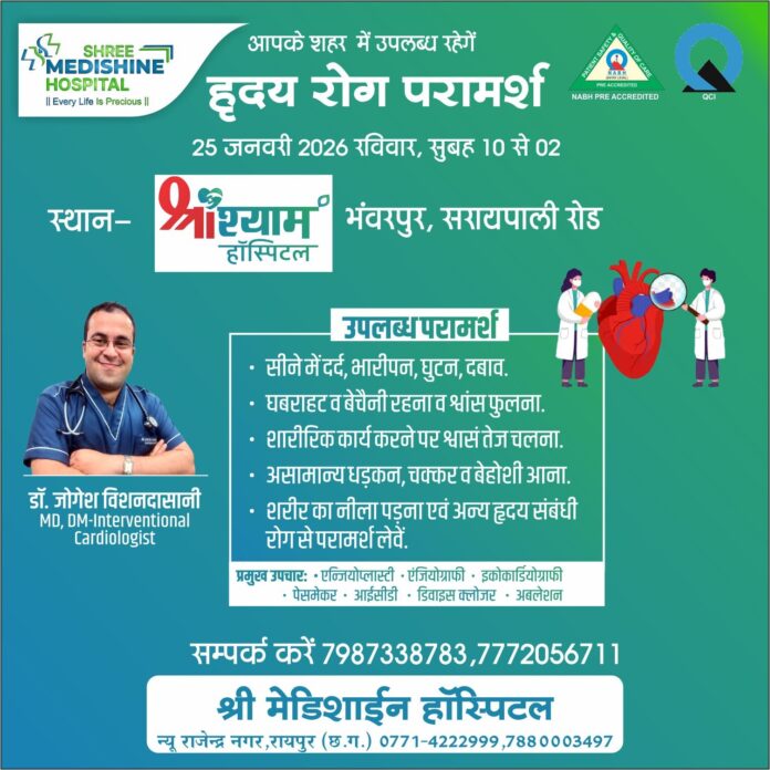 भंवरपुर।श्री मेडिशाइन हॉस्पिटल रायपुर के तत्वावधान में 25 जनवरी 2026 रविवार को भंवरपुर स्थित श्रीश्याम हॉस्पिटल, सरायपाली रोड में विशेष हृदय रोग परामर्श शिविर का आयोजन किया जा रहा है। शिविर सुबह 10 बजे से दोपहर 2 बजे तक चलेगा।