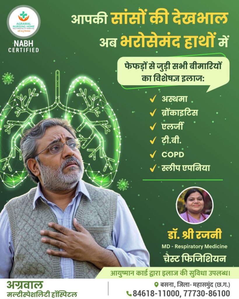 बसना। फेफड़ों से जुड़ी गंभीर बीमारियों से पीड़ित मरीजों के लिए राहत भरी खबर है। अग्रवाल मल्टीस्पेशलिटी हॉस्पिटल, बसना में अब श्वसन रोगों का विशेषज्ञ इलाज उपलब्ध कराया जा रहा है। यहां एम.डी. रेस्पिरेटरी मेडिसिन एवं चेस्ट फिजिशियन डॉ. श्री रजनी द्वारा आधुनिक चिकित्सा पद्धति से मरीजों का उपचार किया जा रहा है।