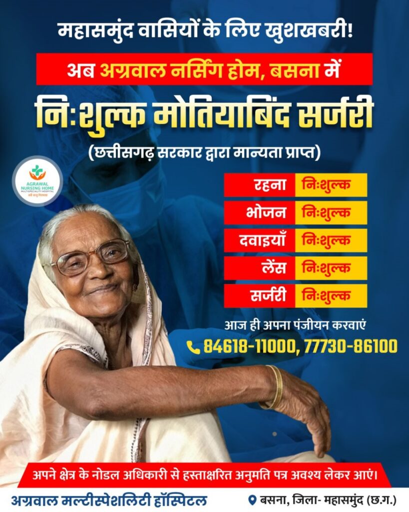 महासमुंदवासियों के लिए खुशखबरी अग्रवाल नर्सिंग होम, बसना में अब निःशुल्क मोतियाबिंद सर्जरी की सुविधा