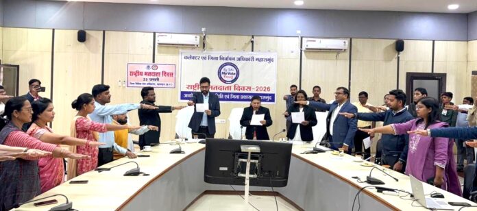 जिला पंचायत के मुख्य कार्यपालन अधिकारी श्री हेमंत नंदनवार ने कहा कि लोकतंत्र में सभी नागरिकों को समान अधिकार प्राप्त हैं और प्रत्येक मतदाता का एक ही वोट होता है। 18 वर्ष पूर्ण करने पर प्रत्येक नागरिक को मताधिकार प्राप्त होता है, जो एक मौलिक अधिकार है। उन्होंने कहा कि ग्रामीण क्षेत्रों में मतदान प्रतिशत अपेक्षाकृत अधिक रहता है और हमें शहरी एवं ग्रामीण दोनों क्षेत्रों में मतदाता जागरूकता को और मजबूत करना होगा। कार्यक्रम में अपर कलेक्टर श्री सचिन भूतड़ा, रवि साहू, अनुविभागीय अधिकारी अक्षा गुप्ता सहित संबंधित अधिकारी-कर्मचारी मौजूद थे। साथ ही जिले के सभी कार्यालयों में राष्ट्रीय मतदाता दिवस के अवसर पर शपथ ली गई।