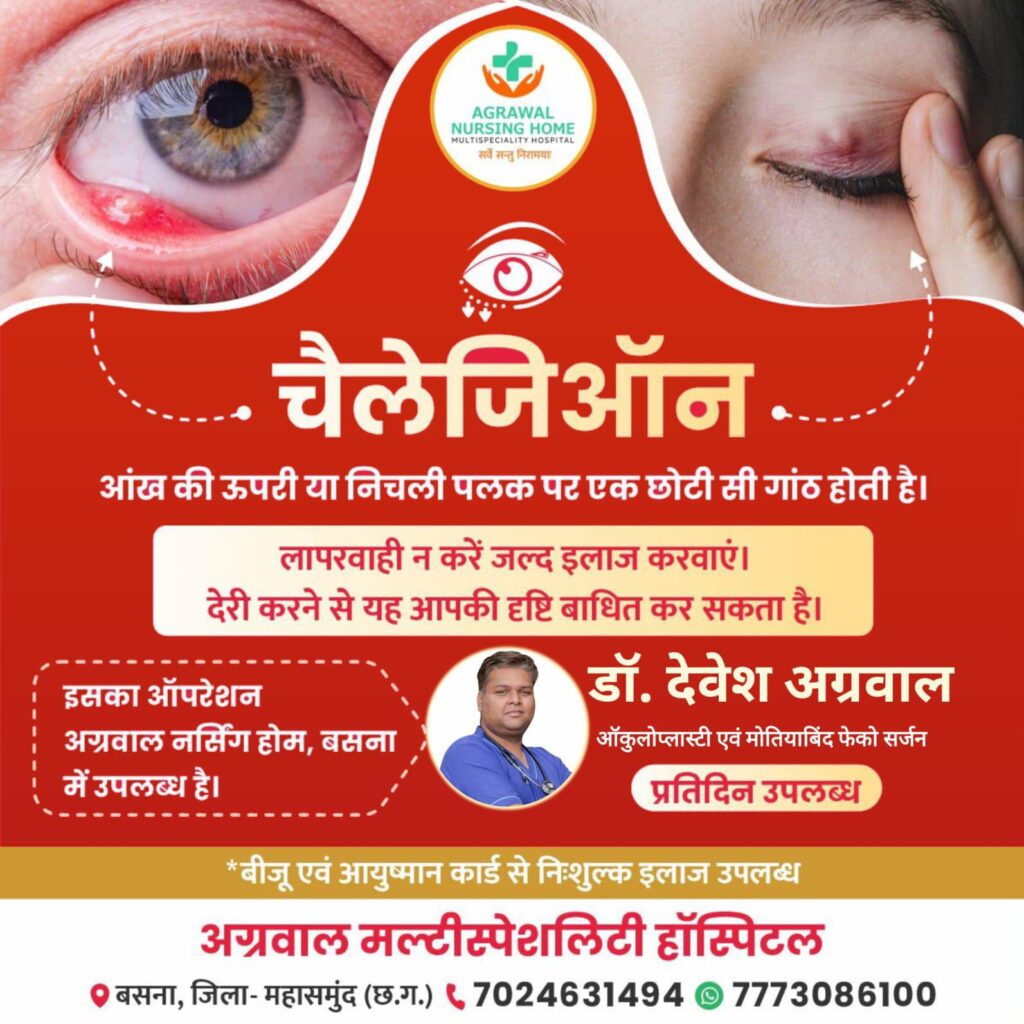 अग्रवाल मल्टीस्पेशलिटी हॉस्पिटल बसना में आंखों की चैलेजियन का आधुनिक उपचार सर्जन डॉ. देवेश अग्रवाल प्रतिदिन उपलब्ध