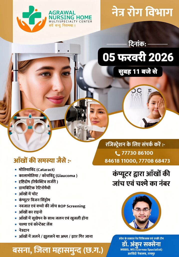 बसना (जिला महासमुंद)। Agrawal Nursing Home Multispecialty Center द्वारा 05 फरवरी 2026 को नेत्र रोग विभाग का विशेष जांच एवं परामर्श शिविर आयोजित किया जा रहा है। यह शिविर सुबह 11 बजे से प्रारंभ होगा, जिसमें कंप्यूटराइज्ड तकनीक से आंखों की जांच तथा चश्मे का नंबर निर्धारित किया जाएगा।