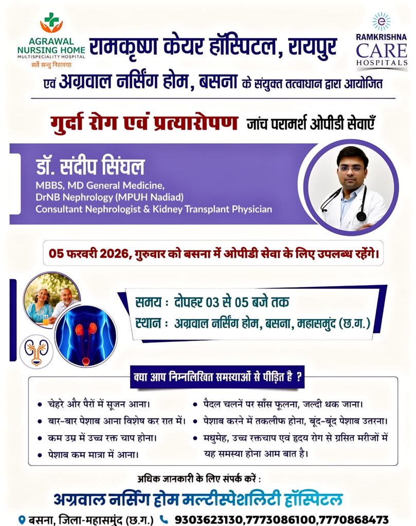 बसना (जिला महासमुंद)। Ramakrishna Care Hospital एवं Agrawal Nursing Home Multispecialty Hospital के संयुक्त तत्वावधान में 05 फरवरी 2026, गुरुवार को बसना में गुर्दा रोग एवं किडनी प्रत्यारोपण से संबंधित जांच एवं परामर्श हेतु विशेष ओपीडी शिविर का आयोजन किया जा रहा है।