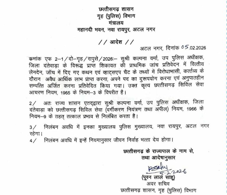 छत्तीसगढ़ सरकार ने DSP कल्पना वर्मा को तुरंत प्रभाव से सस्पेंड कर दिया है. वह अभी दंतेवाड़ा जिले में तैनात हैं. गृह (पुलिस) विभाग ने शुरुआती जांच में उनके खिलाफ गंभीर आरोप पाए जाने के बाद सस्पेंशन का आदेश जारी किया.