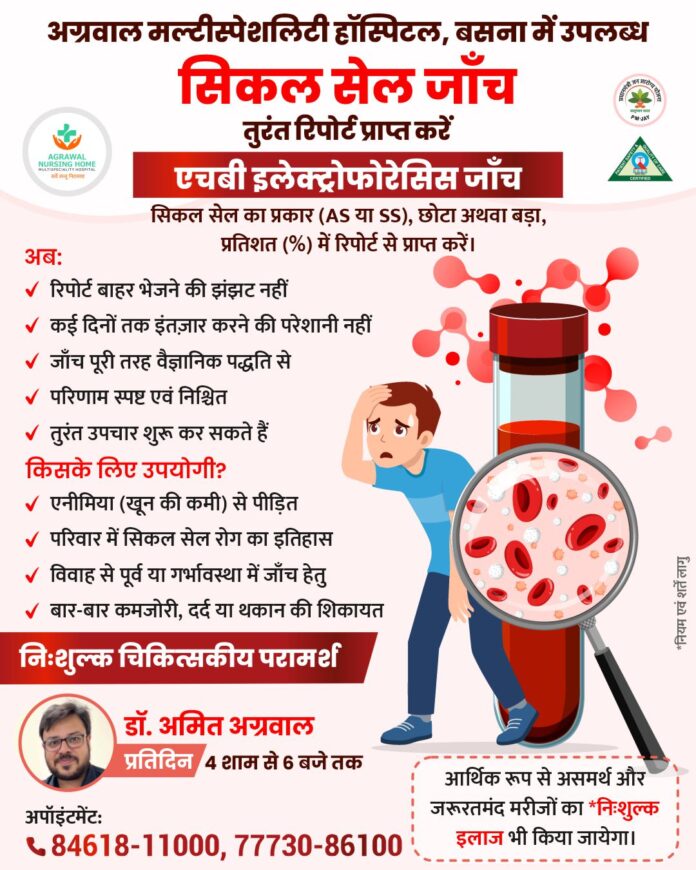 अग्रवाल मल्टीस्पेशलिटी हॉस्पिटल बसना में शुरू हुई सिकल सेल जांच सुविधा प्रतिदिन शाम 4 बजे से 6 बजे तक डॉ. अमित अग्रवाल द्वारा निःशुल्क चिकित्सकीय परामर्श
