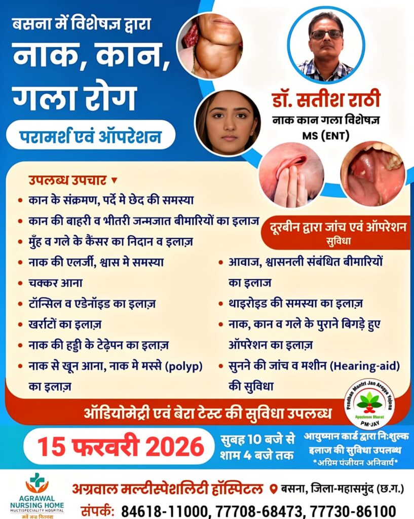 इसके अलावा 15 फरवरी 2026 (रविवार) को नाक, कान एवं गला रोग से संबंधित परामर्श एवं ऑपरेशन सुविधा प्रदान की जाएगी। इस दिन डॉ. सतीश राठी (एमएस ईएनटी) द्वारा कान संक्रमण, नाक की एलर्जी, टॉन्सिल, थायराइड, सुनने की जांच, हियरिंग एड, एंडोस्कोपी एवं ऑडियोमेट्री जैसी सेवाएं उपलब्ध रहेंगी। यह शिविर सुबह 10 बजे से शाम 4 बजे तक आयोजित होगा।
