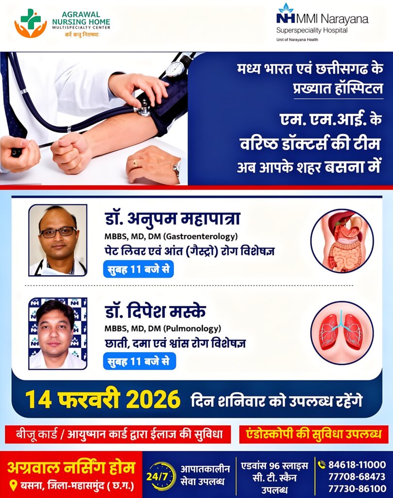14 फरवरी 2026 (शनिवार) को एम.एम.आई. नारायणा हॉस्पिटल से जुड़े वरिष्ठ विशेषज्ञ डॉक्टर बसना में उपलब्ध रहेंगे। इस दौरान डॉ. अनुपम महापात्रा (गैस्ट्रोएंटेरोलॉजी विशेषज्ञ) पेट, लिवर एवं आंत संबंधी रोगों का परामर्श देंगे, वहीं डॉ. विपेश मस्के (पल्मोनोलॉजी विशेषज्ञ) छाती, दमा एवं श्वांस रोगों से पीड़ित मरीजों की जांच एवं उपचार करेंगे। दोनों चिकित्सक सुबह 11 बजे से मरीजों को परामर्श देंगे। बीजू कार्ड एवं आयुष्मान कार्ड धारकों को उपचार की सुविधा उपलब्ध रहेगी, साथ ही एंडोस्कोपी एवं सीटी स्कैन जैसी आधुनिक जांच सुविधाएं भी मौजूद रहेंगी।