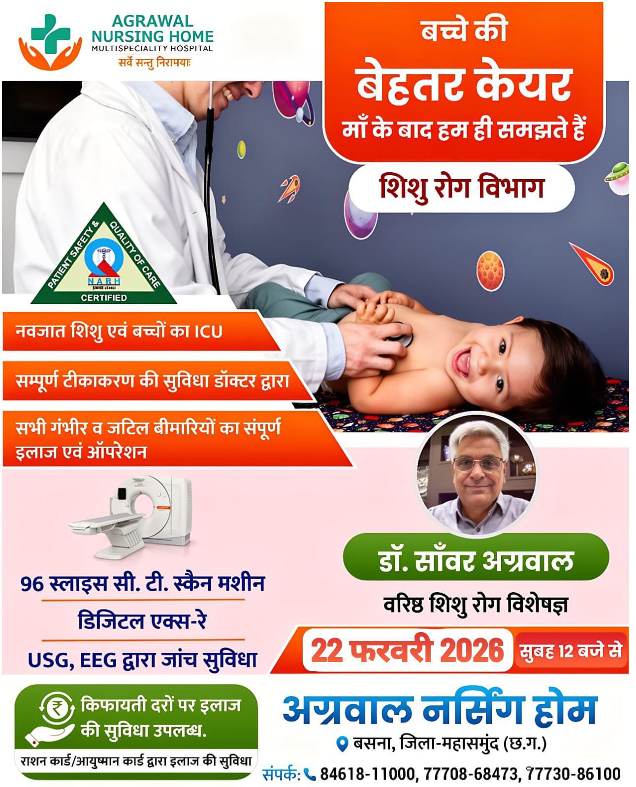 बसना। अग्रवाल नर्सिंग होम, बसना में 22 फरवरी 2026 (रविवार) को वरिष्ठ शिशु रोग विशेषज्ञ डॉ. सॉवर अग्रवाल द्वारा बच्चों के लिए विशेष ओपीडी एवं स्वास्थ्य जांच शिविर आयोजित किया जाएगा। अस्पताल प्रबंधन के अनुसार यह सेवा सुबह 12 बजे से शुरू होगी, जिसमें नवजात शिशुओं से लेकर बड़े बच्चों तक की बीमारियों का परीक्षण और परामर्श दिया जाएगा।