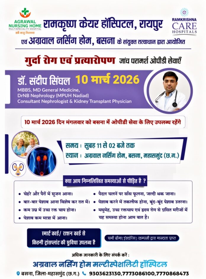 बसना (महासमुंद)। रामकृष्णा केयर हॉस्पिटल रायपुर एवं अग्रवाल नर्सिंग होम बसना के संयुक्त तत्वावधान में गुर्दा रोग एवं प्रत्यारोपण जांच परामर्श ओपीडी का आयोजन किया जा रहा है। यह विशेष ओपीडी 10 मार्च 2026, मंगलवार को आयोजित होगी, जिसमें किडनी संबंधी बीमारियों से पीड़ित मरीजों को विशेषज्ञ परामर्श दिया जाएगा।
