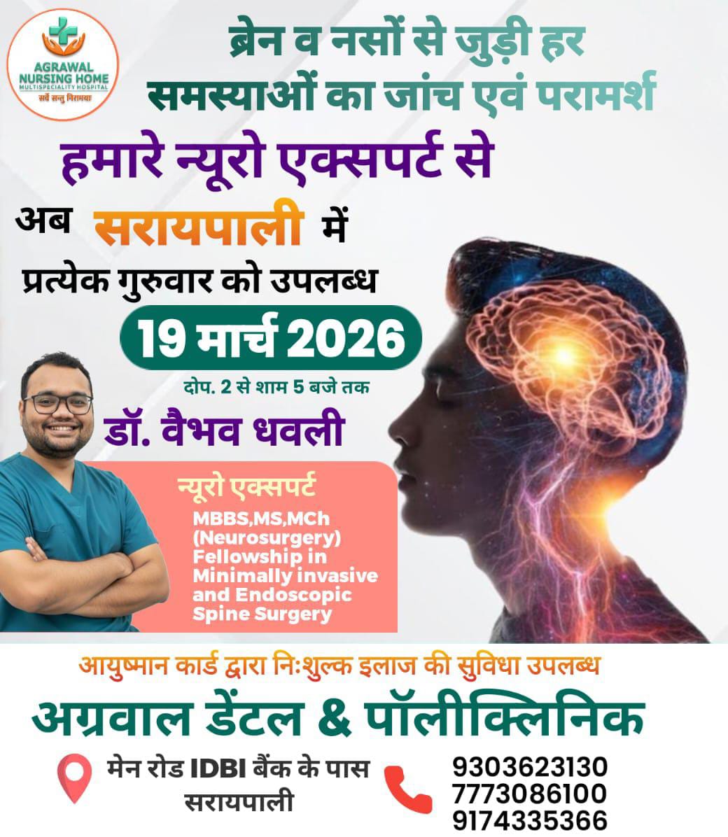 सरायपाली अग्रवाल नर्सिंग होम में मिलेगा ब्रेन-नसों के रोगों का विशेषज्ञ इलाज, न्यूरो सर्जन डॉ. वैभव धवली 19मार्च दोपहर 2 बजे से शाम 5 बजे तक देंगे सेवाएं