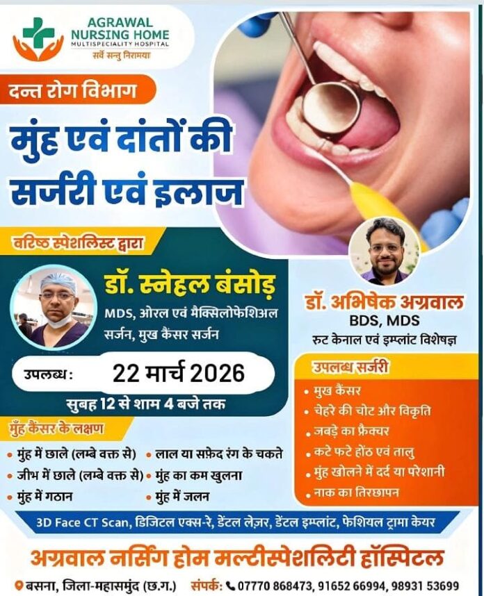 महासमुंद। शहर के अग्रवाल नर्सिंग होम मल्टीस्पेशलिटी हॉस्पिटल में आज 22 मार्च 2026 को दंत एवं मुख रोगों से संबंधित विशेष परामर्श एवं उपचार शिविर का आयोजन किया जा रहा है। यह शिविर सुबह 12 बजे से शाम 4 बजे तक संचालित होगा, जिसमें अनुभवी विशेषज्ञ मरीजों की जांच एवं उपचार करेंगे।