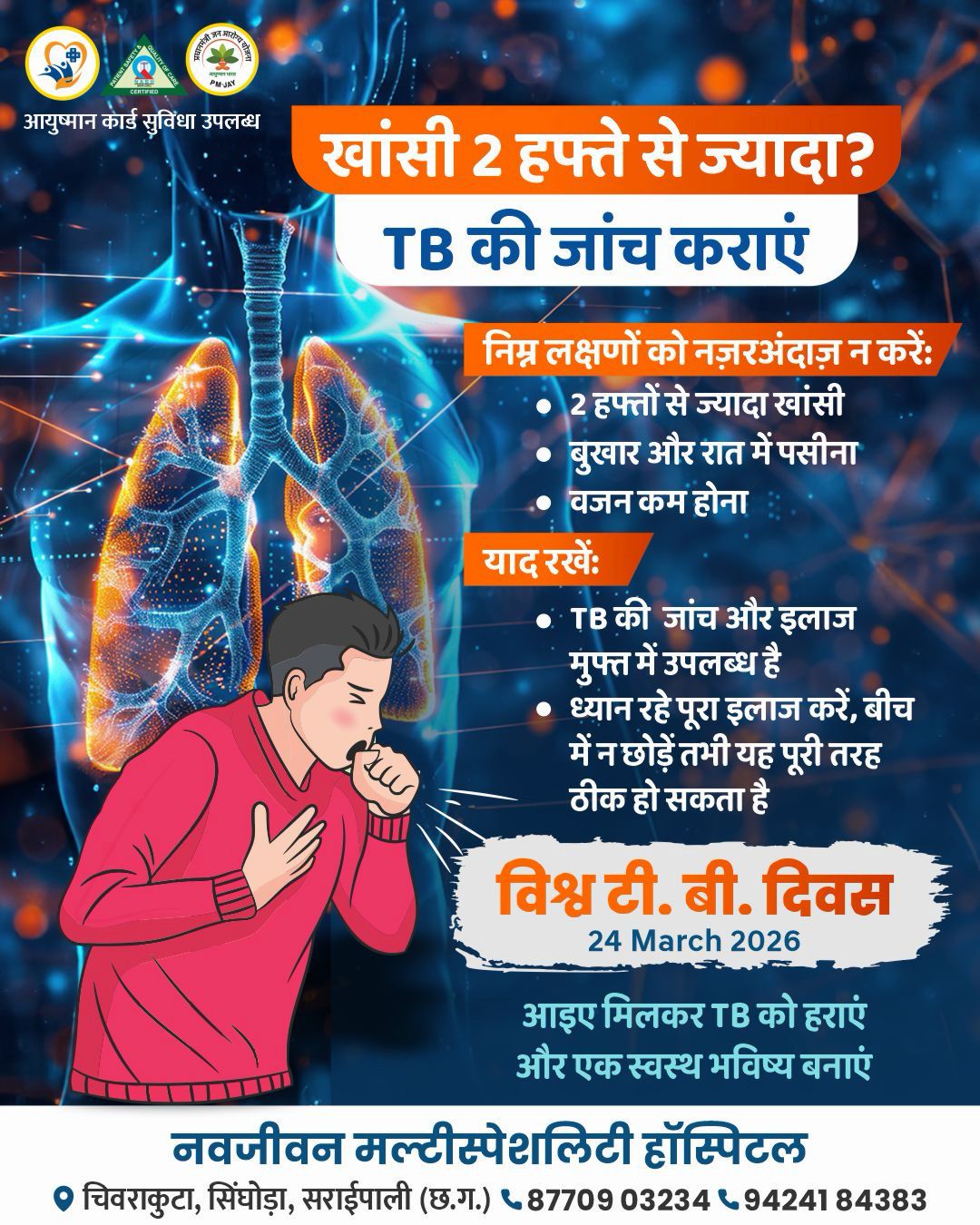 सरायपाली क्षेत्र स्थित नवजीवन मल्टीस्पेशलिटी हॉस्पिटल, चिवराकुटा (सिंघोड़ा) द्वारा विश्व टी.बी. दिवस (24 मार्च 2026) के अवसर पर टीबी के प्रति लोगों को जागरूक करने के लिए विशेष अभियान चलाया गया। अस्पताल प्रबंधन ने लोगों से अपील की है कि यदि किसी व्यक्ति को 2 सप्ताह से अधिक समय तक लगातार खांसी हो रही है, तो इसे नजरअंदाज न करें और तुरंत टीबी की जांच कराएं।