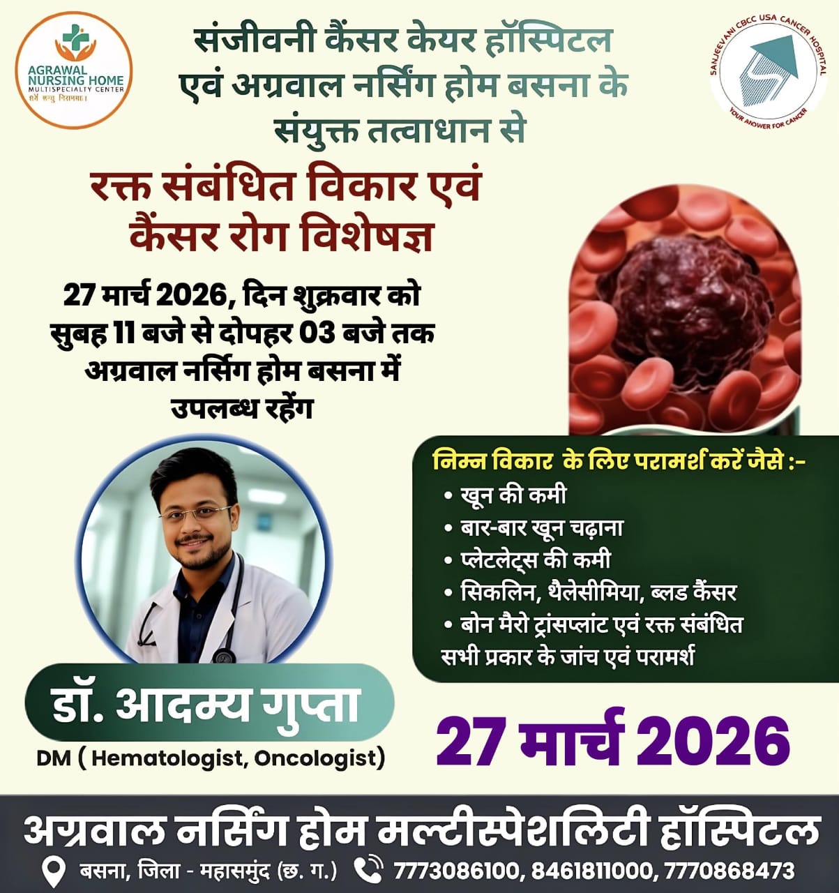 बसना/अग्रवाल नर्सिंग होम बसना में 27 मार्च को रक्त एवं कैंसर रोग विशेषज्ञ डॉ. आदम्य गुप्ता देंगे परामर्श