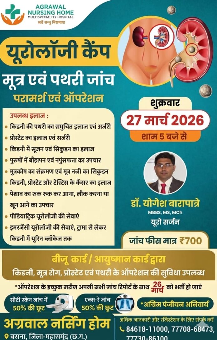 बसना (महासमुंद)। अग्रवाल नर्सिंग होम, बसना में 27 मार्च 2026 (शुक्रवार) शाम 5 बजे से को यूरोलॉजी कैंप का आयोजन किया जा रहा है। इस विशेष शिविर में प्रसिद्ध यूरो सर्जन डॉ. योगेश बारापात्रे द्वारा मरीजों की जांच, परामर्श एवं आवश्यक ऑपरेशन की सुविधा उपलब्ध कराई जाएगी।
