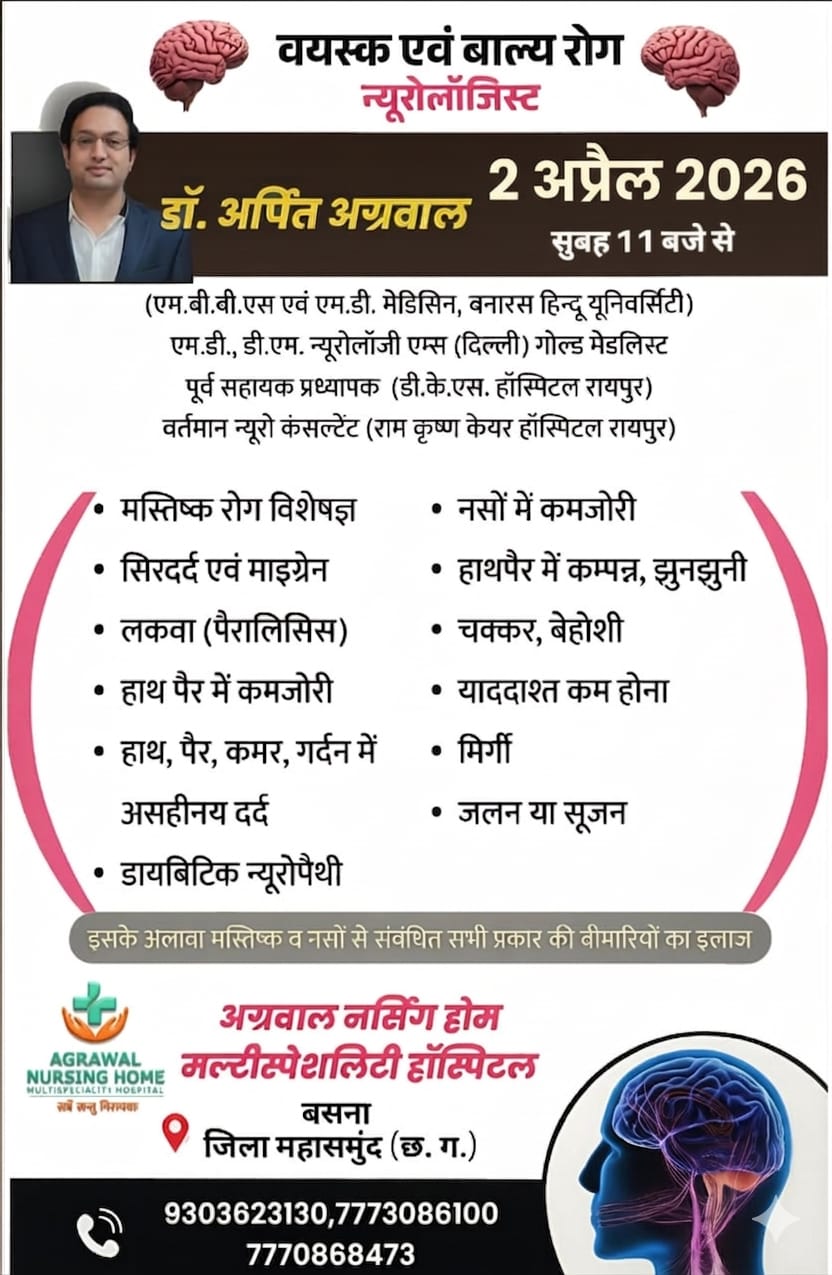 बसना (जिला महासमुंद) में स्वास्थ्य सुविधाओं को मजबूती देते हुए अग्रवाल नर्सिंग होम मल्टीस्पेशलिटी हॉस्पिटल में 2 अप्रैल 2026 को न्यूरोलॉजिस्ट डॉ.  अर्पित अग्रवाल की विशेष ओपीडी आयोजित की जा रही है। मरीज सुबह 11 बजे से परामर्श ले सकेंगे।