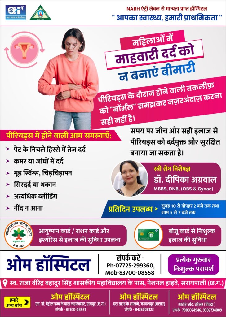 सरायपाली: ओम हॉस्पिटल में आयुष्मान, राशन कार्ड व इंश्योरेंस से इलाज, बीपीएल को मुफ्त सुविधा — माहवारी दर्द को हल्के में लेना पड़ सकता है भारी: डॉक्टरों की चेतावनी