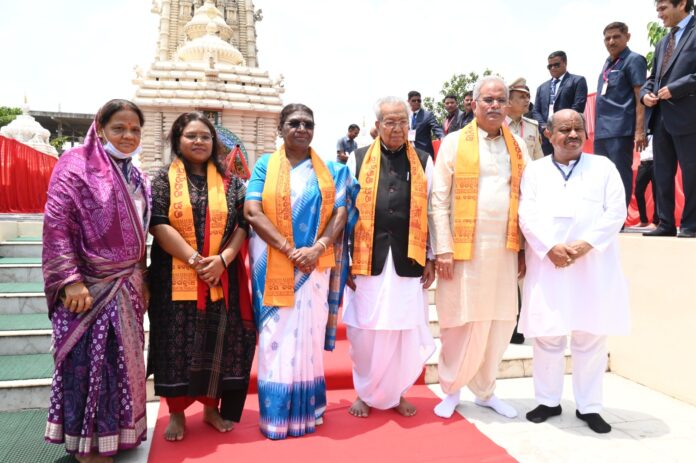 राष्ट्रपति द्रौपदी मुर्मू अपने 2 दिवसीय दौरे पर छत्तीसगढ़ में हैं। इस दौरान वे राजधानी रायपुर में स्थित जगन्नाथ छत्तीसगढ़ के मुख्यमंत्री के भूपेश बघेल के साथ मंदिर में पहुंचीं। राष्ट्रपति द्रौपदी मुर्मू ने यहां पहुंचकर विशेष पूजा-अर्चना की। भगवान जगन्नाथ, बलभद्र और सुभद्रा का आशीर्वाद लेने के बाद राष्ट्रपति रायपुर में आयोजित विभिन्न कार्यक्रमों में शामिल हो रही हैं।