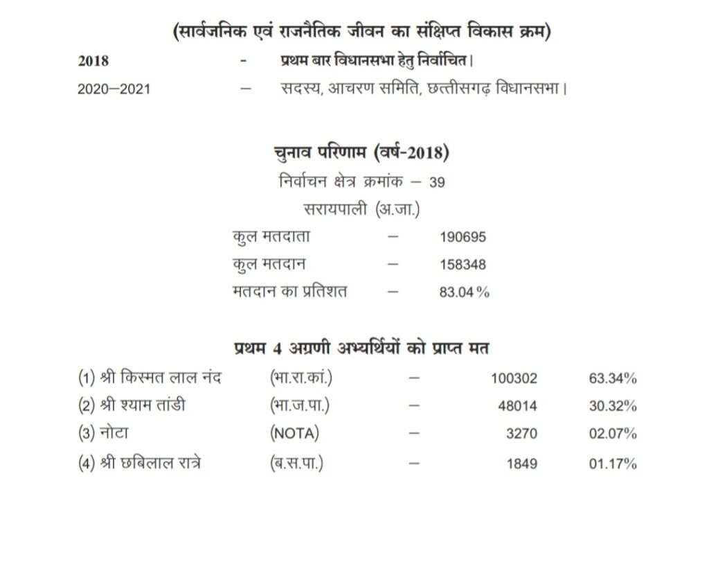 वही भाजपा से श्याम तांडी को 48014 मिले जबकि छग में 2018 के विधानसभा में कांग्रेस का लहर चल रहा था ।