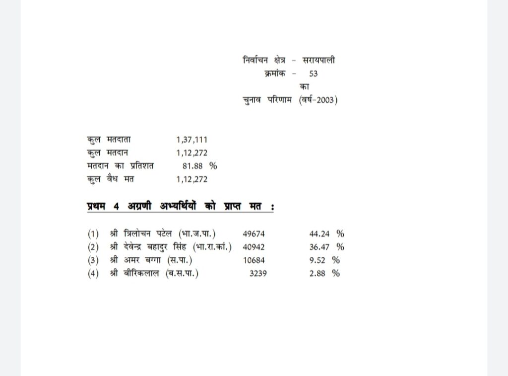 बीजेपी के त्रिलोचन पटेल को 48234 वोट मिले थे और भाजपा से विधायक चुने गए थे वही कांग्रेस के देवेंद्र बहादुर सिंह 40942 वोट मिले थे जो अभी वर्तमान में बसना विधायक है फिलहाल देवेंद्र बहादुर सिंह को किसी परिचय का मोहताज नही है