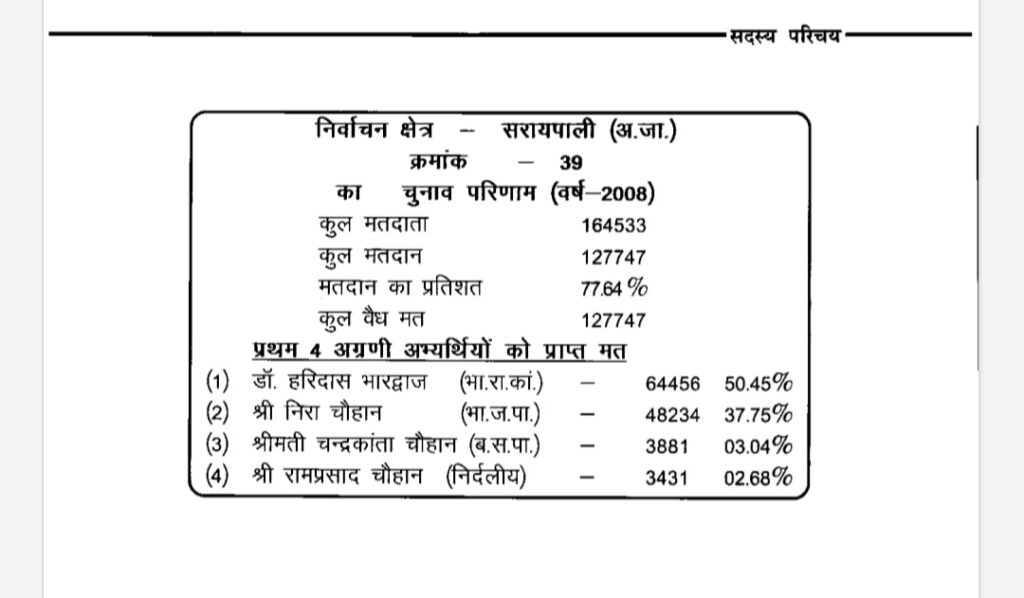 2008 के विधानसभा चुनाव परिणाम इसमें कांग्रेस के डॉ. हरि दास भारद्वाज को 64456 वोट मिले थे और वे विधायक चुने गए