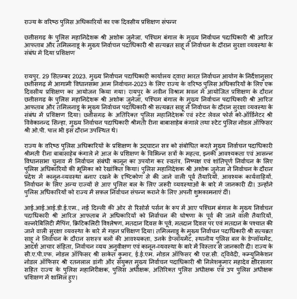 मुख्य निर्वाचन पदाधिकारी कार्यालय द्वारा भारत निर्वाचन आयोग के निर्देशानुसार छत्तीसगढ़ में आगामी विधानसभा आम निर्वाचन-2023 के लिए राज्य के वरिष्ठ पुलिस अधिकारियों के लिए एक दिवसीय प्रशिक्षण का आयोजन किया गया।