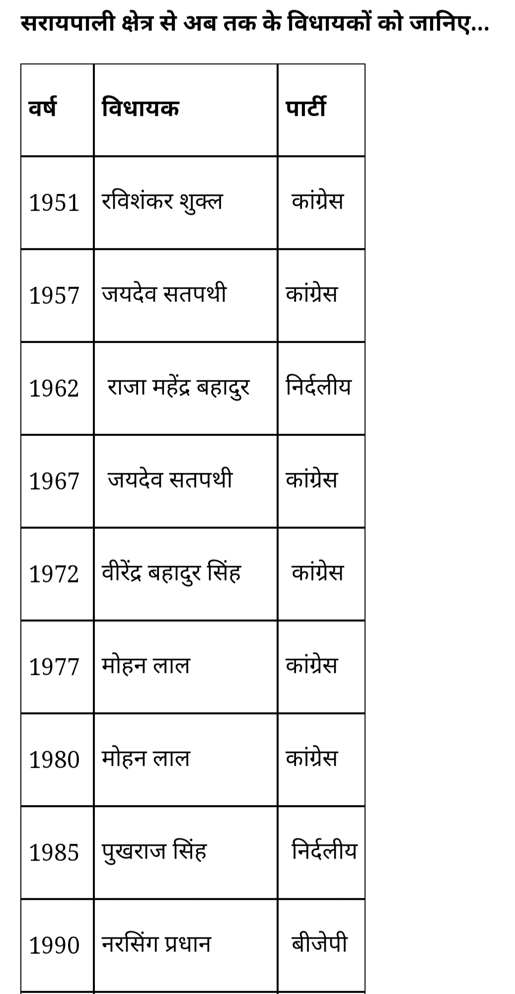 सरायपाली विधानसभा क्षेत्र में अब तक कुल 15 विधानसभा चुनाव हुए हैं। इन चुनावों में कांग्रेस के हिस्से 10, भाजपा को 3 और 2 बार निर्दलीय के हिस्से में जीत आई। सरायपाली में कांग्रेस के विजयी रथ को रोकने का काम किया भाजपा के नरसिंग प्रधान ने। साल 1990 के विधानसभा चुनाव में नरसिंग प्रधान के सामने पूर्व विधायक पुखराज सिंह थे। ठीक पांच साल पहले निर्दलीय प्रत्याशी के रूप में चुनाव जीतने वाले पुखराज सिंह को इस बार कांग्रेस ने