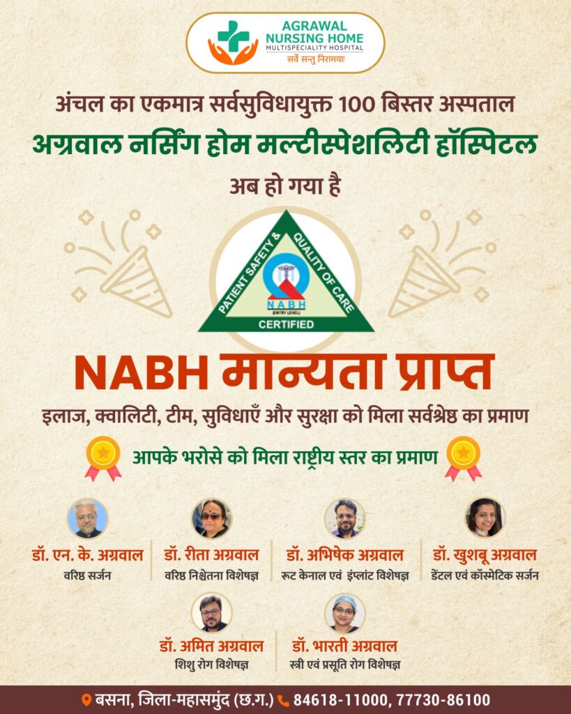 बसना : अग्रवाल नर्सिंगहोम को मिली एनएबीएच की मान्यता इसके लिए हॉस्पिटल को कठिन परीक्षा व जांच के दौर से गुजरना पड़ता है। महासमुन्द जिले के बसना शहर के जाने माने अस्पताल अग्रवाल नर्सिंगहोम बसना को और एक बड़ी उपलब्धी मिल चुका है