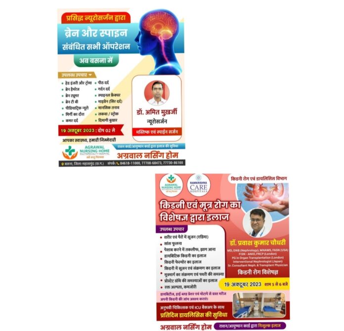 महासमुन्द बसना के अग्रवाल नर्सिंगहोम बसना में कल 19 अक्टूबर 2 अलग अलग विशेषज्ञ डॉक्टर सेवा देंगे जिसमे किडनी एवं मूत्र रोग का