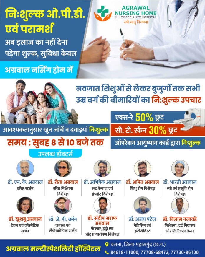 बसना : निःशुक्ल इलाज एवं परामर्श सुविधा केवल अग्रवाल नर्सिंगहोम में महासमुन्द जिले के बसना अग्रवाल नर्सिंगहोम बसना में