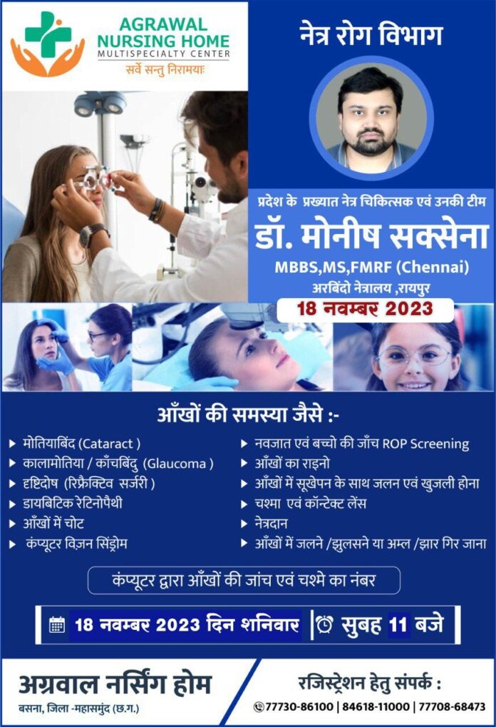 बसना : आंखों की सभी प्रकार के समस्याओं के लिए अग्रवाल नर्सिंगहोम बसना में विशेषज्ञ इस दिन उपलब्ध रहंगे देखें और सम्बंधित उपलब्ध सेवाएं ।