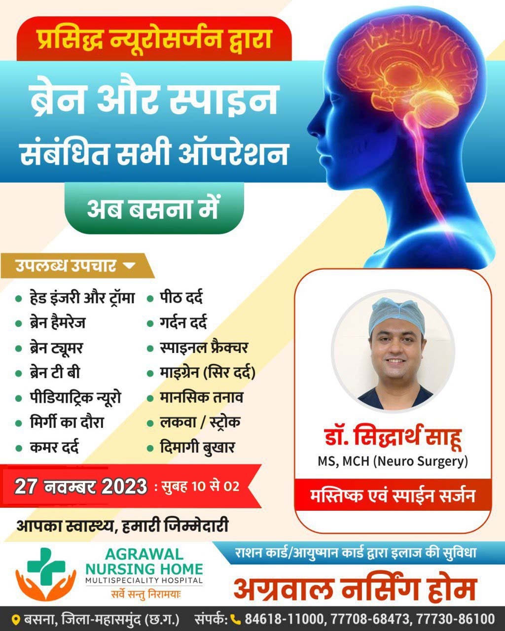 बसना : 27 को प्रसिद्ध न्यूरोसर्जन द्वारा ब्रेन और स्पाइन संबंधित सभी ऑपरेशन अब बसना के अग्रवाल नर्सिंगहोम में ।