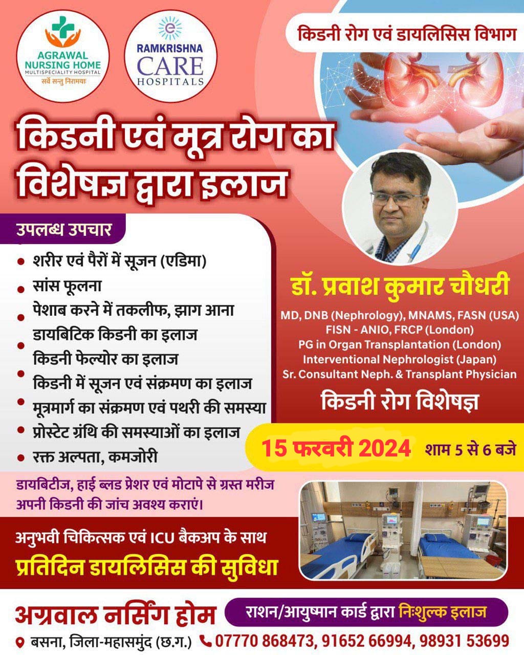 अग्रवाल नर्सिंग हॉस्पिटल बसना में किडनी एवं मूत्र रोग का विशेषज्ञ द्वारा इलाज उपलब्ध उपचार कल 15 फरवरी