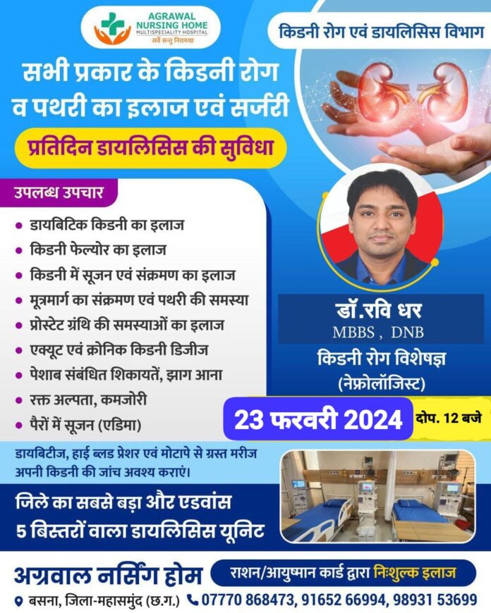 जिले का सबसे बड़ा और एडवांस 5 बिस्तरों वाला डायलिसिस यूनिट अग्रवाल नर्सिंग होम राशन / आयुष्मान कार्ड द्वारा निःशुल्क इलाज • बसना, जिला महासमुंद (छ.ग.) 07770868473, 9165266994, 9893153699
