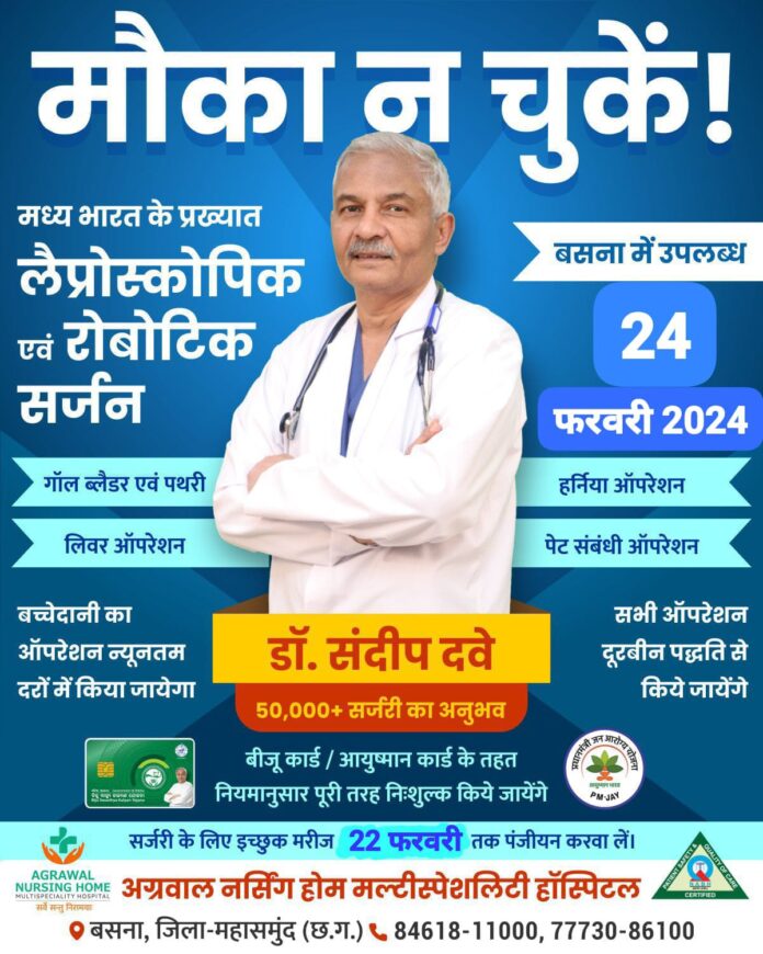 अग्रवाल नर्सिंग होम बसना मौका न चुकें ! मध्य भारत के प्रख्यात लैप्रोस्कोपिक एवं रोबोटिक सर्जन गॉल ब्लैडर एवं पथरी लिवर ऑपरेशन बच्चेदानी का ऑपरेशन न्यूनतम दरों में किया जायेगा