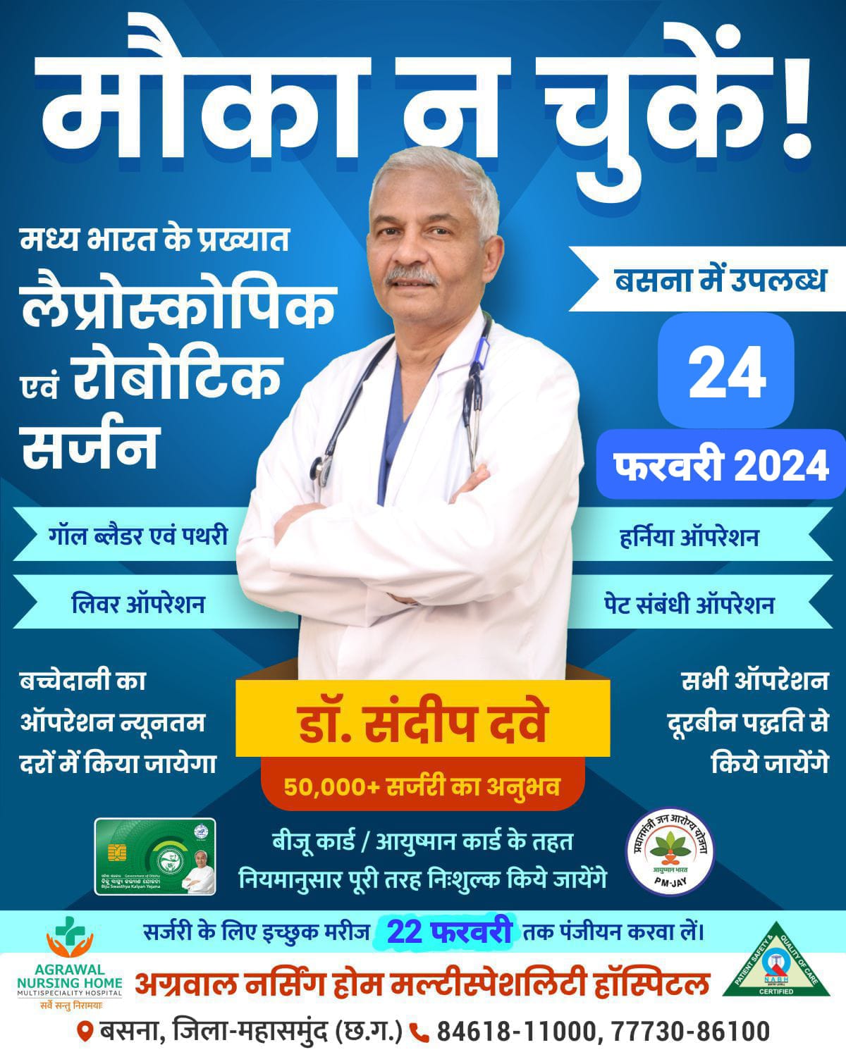 बसना डॉ. संदीप दवे 50,000+ सर्जरी का अनुभव कार्ड /आयुष्मान कार्ड के तहत बसना में उपलब्ध 24 फरवरी 2024 हर्निया ऑपरेशन पेट संबंधी ऑपरेशन नियमानुसार पूरी तरह निःशुल्क किये जायेंगे सभी ऑपरेशन दूरबीन पद्धति से किये जायेंगे। सर्जरी के लिए इच्छुक मरीज 22 फरवरी तक पंजीयन करवा लें।