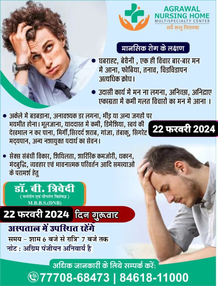 • अकेले में बडबडाना, अनावश्यक डर लगना, भीड़ या अन्य जगहों पर भयभीत होना। भूलजाना, याददास्त में कमी, डिमेंशिया, स्वयं की देखभाल न कर पाना, मिर्गी,सिरदर्द शराब, गांजा, तंबाकू, सिगरेट 22 फरवरी 2024 मद्यपान, अन्य नशायुक्त पदार्थ का सेवन ।• सेक्स संबंधी विकार, शिथिलता, शारिरिक कमजोरी, थकान, मंदबुद्धि, व्यवहार एवं भावनात्मक परिवर्तन आदि समस्याओं के परामर्श हेतु डॉ. बी. त्रिवेदी (मनोरोग एवं यौनरोग विशेषज्ञ) M.B.B.S.(DNB) 22 फरवरी 2024 दिन गुरूवार अस्पताल में उपस्थित रहेंगे समय – शाम 6 बजे से रात्रि 7 बजे तक नोट : अग्रिम पंजीयन अनिवार्य है अधिक जानकारी के लिये सम्पर्क करें: 77708-68473 | 84618-11000