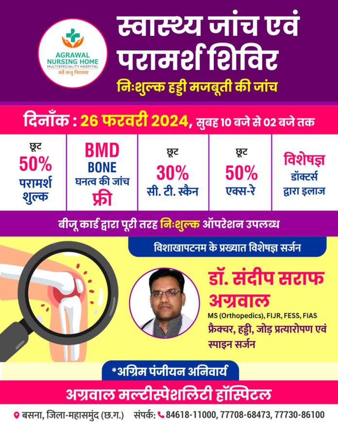 स्वास्थ्य जांच एवं परामर्श शिविर निःशुल्क हड्डी मजबूती की जांच दिनांक : 26 फरवरी 2024, सुबह 10 बजे से 02 बजे तक