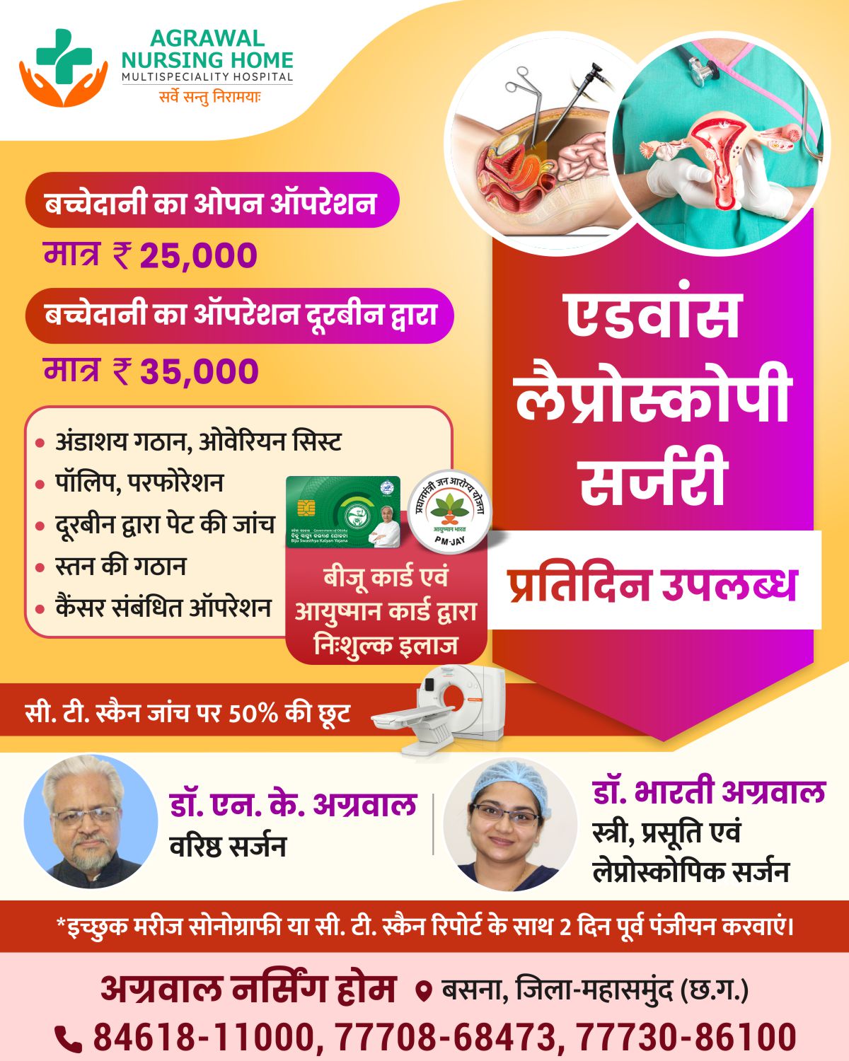 स्त्री, प्रसूति एवं लेप्रोस्कोपिक सर्जन इच्छुक मरीज सोनोग्राफी या सी. टी. स्कैन रिपोर्ट के साथ 2 दिन पूर्व पंजीयन करवाएं। अग्रवाल नर्सिंग होम  बसना, जिला महासमुंद (छ.ग.) 84618-11000, 77708-68473, 77730-86100