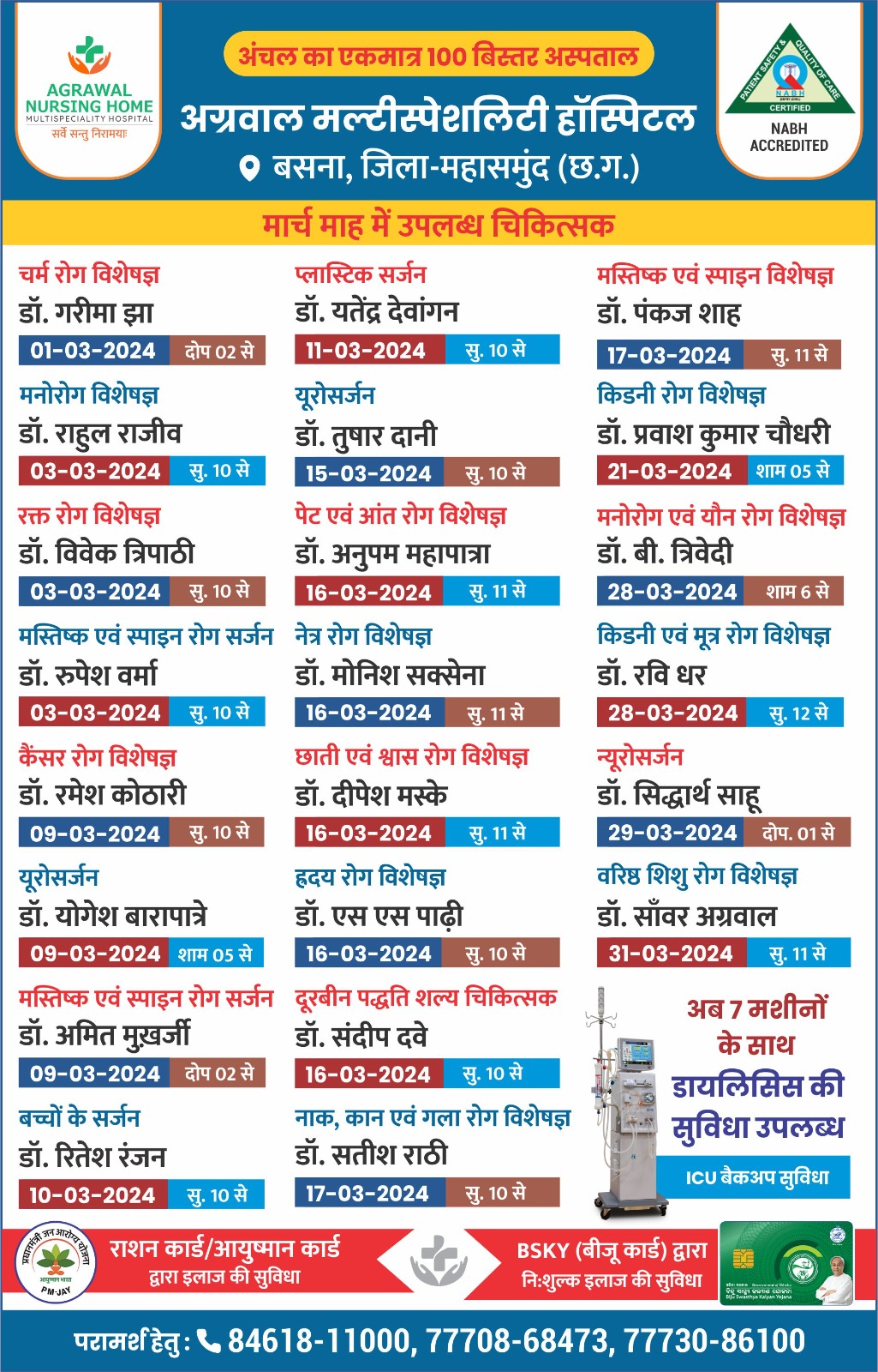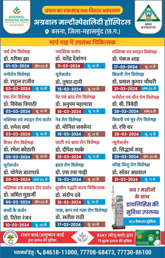 अग्रवाल नर्सिंग होम बसना में मार्च माह में उपलब्ध चिकित्सक द्वारा इलाज