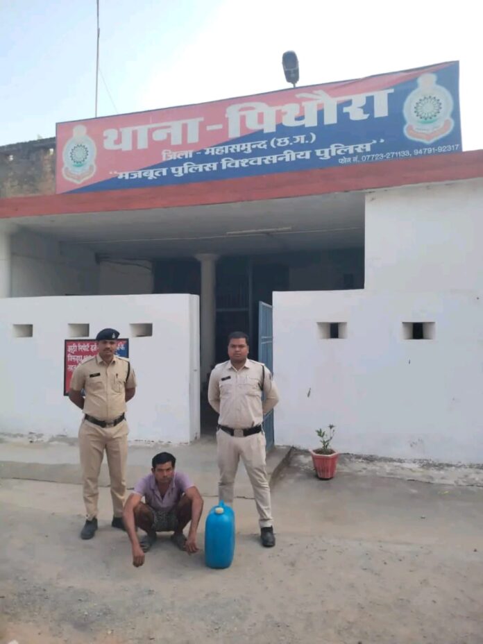 पिथौरा थाना : ग्राम ठाकुरदिया खुर्द का हिरालाल सिन्हा अपने घर के बाडी में शराब बिक्री हेतु रखे 12लीटर महुआ शराब के खिलाफ कार्रवाई थाना पिथौरा में महिला प्रधान आरक्षक क्रमांक 231 के अनुसार दिनांक 28.02.2024 को हमराह आरक्षक 394, 529, 197 के अवैध शराब रेड कार्यवाही पर देहात रवाना हुआ था कि जरिये मुखबीर सूचना मिला कि ग्राम ठाकुरदिया खुर्द का हिरालाल सिन्हा अपने घर के बाडी में शराब बिक्री हेतु रखा है कि सूचना पर गवाह सोनूराम यादव एवं नेतराम प्रजापति को धारा 160 जाफौ. का नोटिस तामिल कर साथ लेकर ग्राम ठाकुरदिया खुर्द मुखबीर के बताये हुये स्थान पर पहुंचकर घेराबंदी करने पर एक व्यक्ति मिला जिसे पूछताछ करने पर अपना नाम हिरालाल सिन्हा पिता गाडाराय सिन्हा उम्र 44 साल साकिन ठाकुरदिया खुर्द थाना पिथौरा जिला महासमुंद बताया तथा अपने पास एक नीला रंग की 20 लीटर क्षमता वाली जरीकेन में भरा करीबन 12 लीटर हाथ भट्टी निर्मित महुआ शराब रखे मिला जिसे गवाहों के समक्ष बरामद किया गया