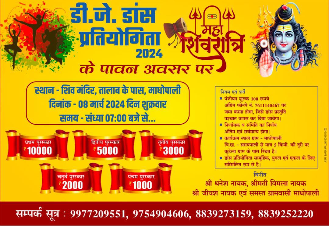 महाशिवरात्रि पर 8 मार्च को माधोपाली में डीजे डांस प्रतियोगिता, पहले से करवा ले पंजीयन सराईपाली. महाशिवरात्रि के उपलक्ष्य में ग्राम माधोपाली में 8 मार्च को रात्रि कालीन डीजे डांस प्रतियोगिता का आयोजन किया गया है. डांस प्रतियोगिता में प्रतिभागी सामूहिक डांस , युगल डांस और एकल डांस के रूप में भाग ले सकते हैं. जिसमे प्रथम पुरस्कार 10 हजार रुपए, द्वितीय पुरस्कार 5000, तृतीय पुरुस्कार 3000, चतुर्थ पुरस्कार 2000 और पंचम पुरस्कार 1000 रुपए रखा गया है. पंजीयन शुल्क 100 रुपए पहले से जमा करना होगा जिसे डांस प्रस्तुति के बाद वापस किया जाएगा. अधिक जानकारी के लिए 7611140467, 9977209551, 9754904606, 8839273159 नंबर पर संपर्क कर सकते हैं. कार्यक्रम का आयोजन पूर्व जनपद अध्यक्ष धनेश नायक, विमला नायक, जीयश नायक एवं समस्त ग्रामवासी माधोपाली के द्वारा किया जा रहा है.