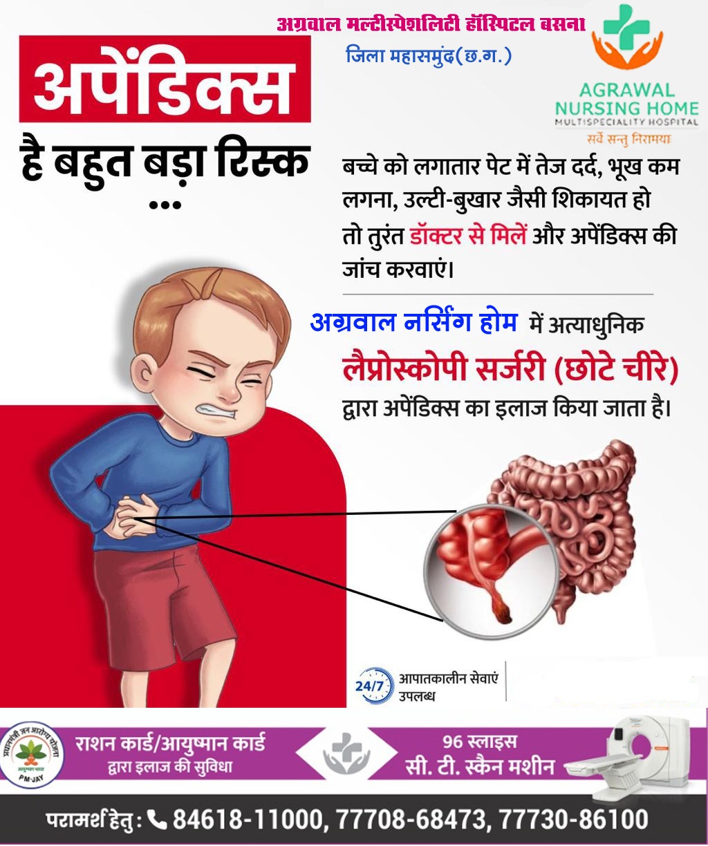 बसना -: बच्चे को लगातार पेट में तेज दर्द, भूख कम अपेंडिक्स है बहुत बड़ा रिस्क जांच करवाएं अग्रवाल नर्सिंगहोम बसना मे