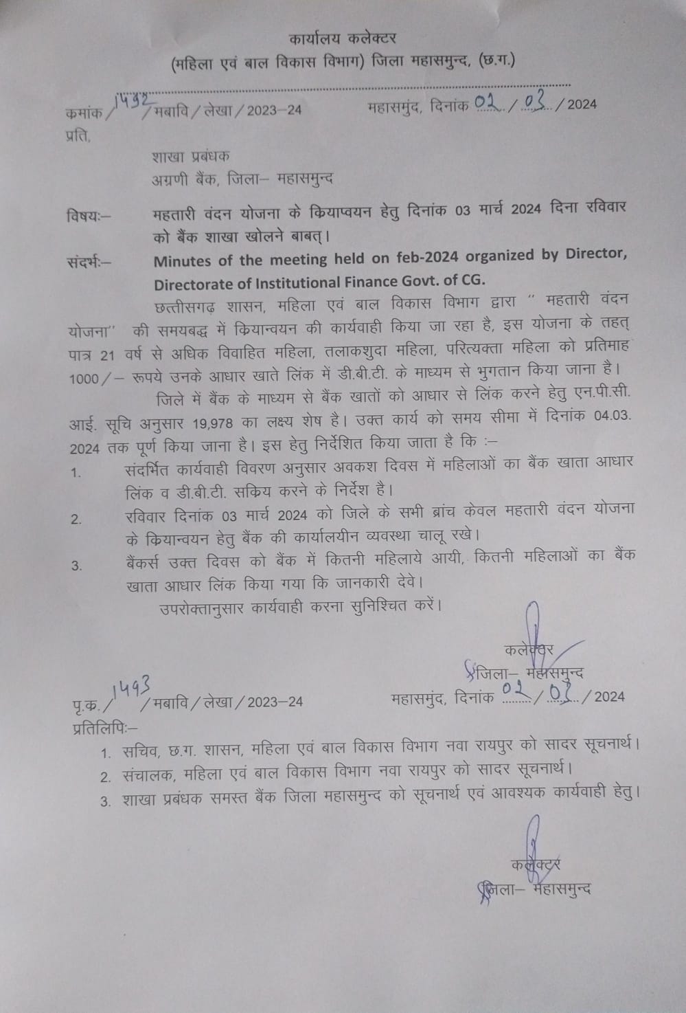 जिसके तहत अवकाश दिवस में महिलाओं का बैंक खाता आधार लिंक व डीबीटी सक्रिय करने के निर्देश है। जिले के सभी ब्रांच को 3 मार्च रविवार को केवल महतारी वंदन योजना के क्रियान्वयन हेतु बैंक की कार्यालयीन व्यवस्था चालू रखने हेतु निर्देशित किया गया है।