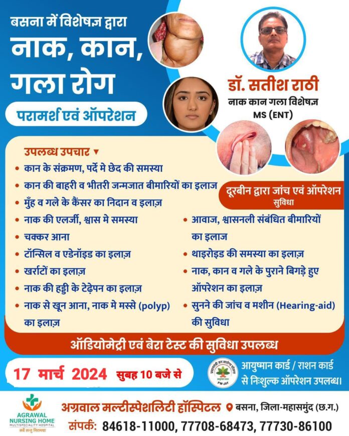 बसना : अग्रवाल नर्सिंग होम बसना में विशेषज्ञ द्वारा नाक, कान, गला रोग परामर्श एवं ऑपरेशन