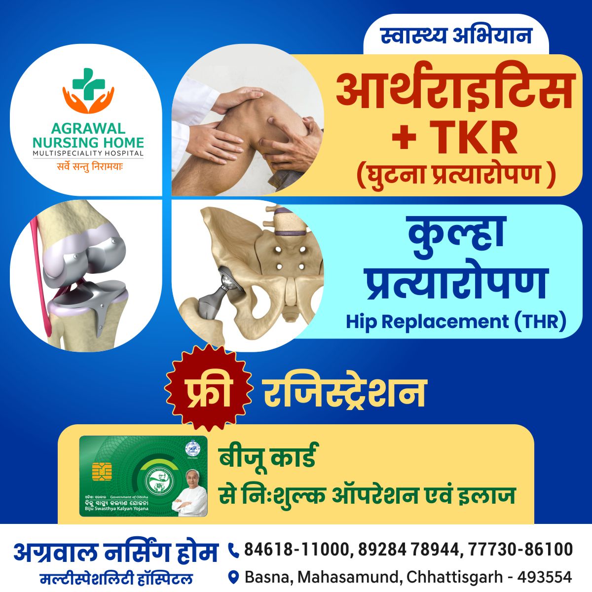 बसना : अग्रवाल नर्सिंग होम बसना में स्वास्थ्य अभियान आर्थराइटिस + TKR (घुटना प्रत्यारोपण) कुल्हा प्रत्यारोपण बीजू कार्ड से निःशुल्क ऑपरेशन एवं इलाज