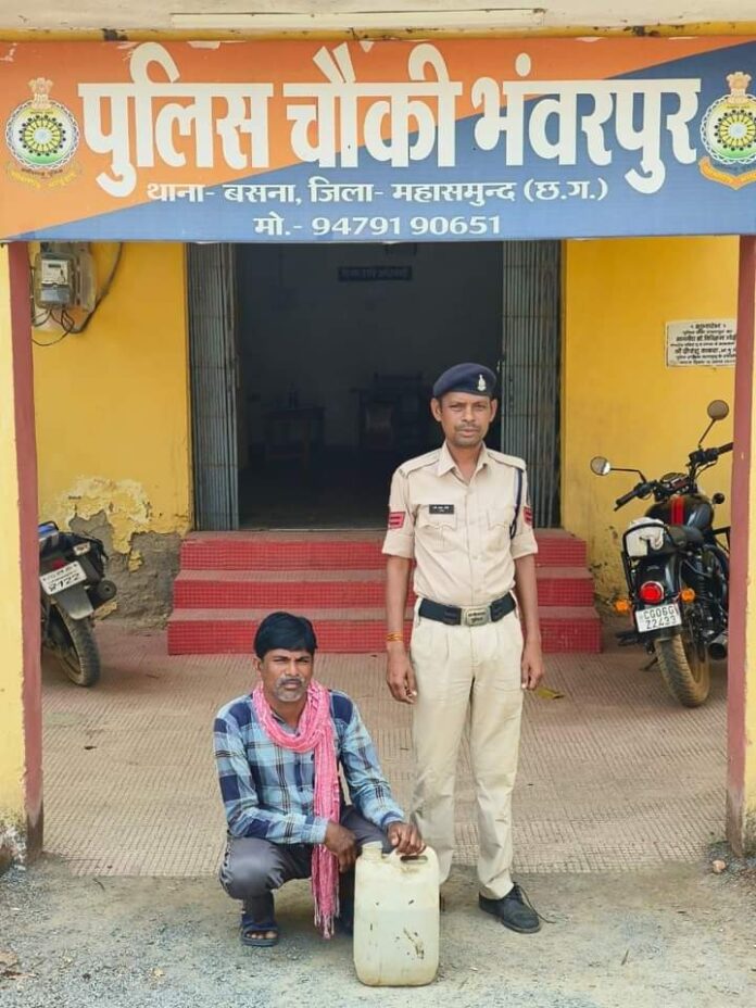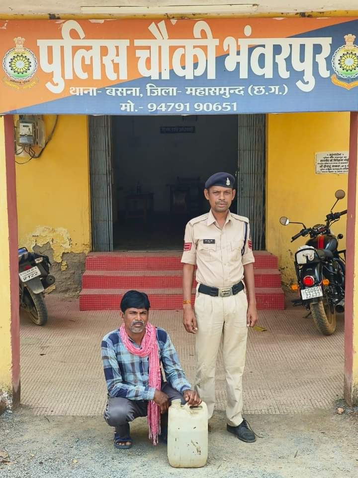 चौकी भंवरपुर थाना बसना जिला महामसुन्द में प्र0आर0 के अनुसार दिनांक 24.03.2024 को हमराह प्रआर 597,109 आर 409 के प्रायवेट मोटर सायकल से अपराध विवेचना व जुर्म जरायम पतासाजी हेतु ग्राम खोकसा,बडे साजापाली की ओर रवाना हुआ था कि जरिये मोबाईल फोन से मुखबीर से सूचना मिला कि एक व्यक्ति ग्राम खोकसा रोड किनारे तालाब के पास अवैध रूप से हाथ भट्ठी से तैयार महुआ शराब बिक्री वास्ते ग्राहक ढुंढ रहा है कि सूचना पर मुखबीर पंचनामा तैयार कर गवाह सौभाग्य ताण्डी एवं बारेलाल ताण्डी को धारा 160 जा0फौ0 के नोटिस देकर हमराह स्टाफ एवं गवाहों को लेकर मुखबीर के बताये स्थान पर जाकर रेड कार्यवाही किये जहां एक व्यक्ति मिला जिसे नाम पता पुछने पर अपना नाम राधेश्याम सागर पिता स्व करमू उम्र 45 साल साकिन खोकसा चौकी भंवरपुर थाना बसना जिला महासमुन्द का निवासी होना बताया
