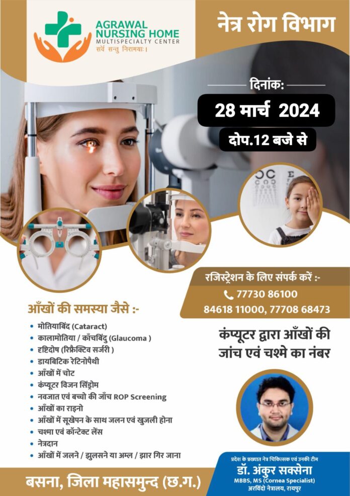 बसना : प्रदेश के प्रख्यात नेत्र चिकित्सक एवं उनकी टीम 28 मार्च 2024 को अग्रवाल नर्सिंग होम बसना में