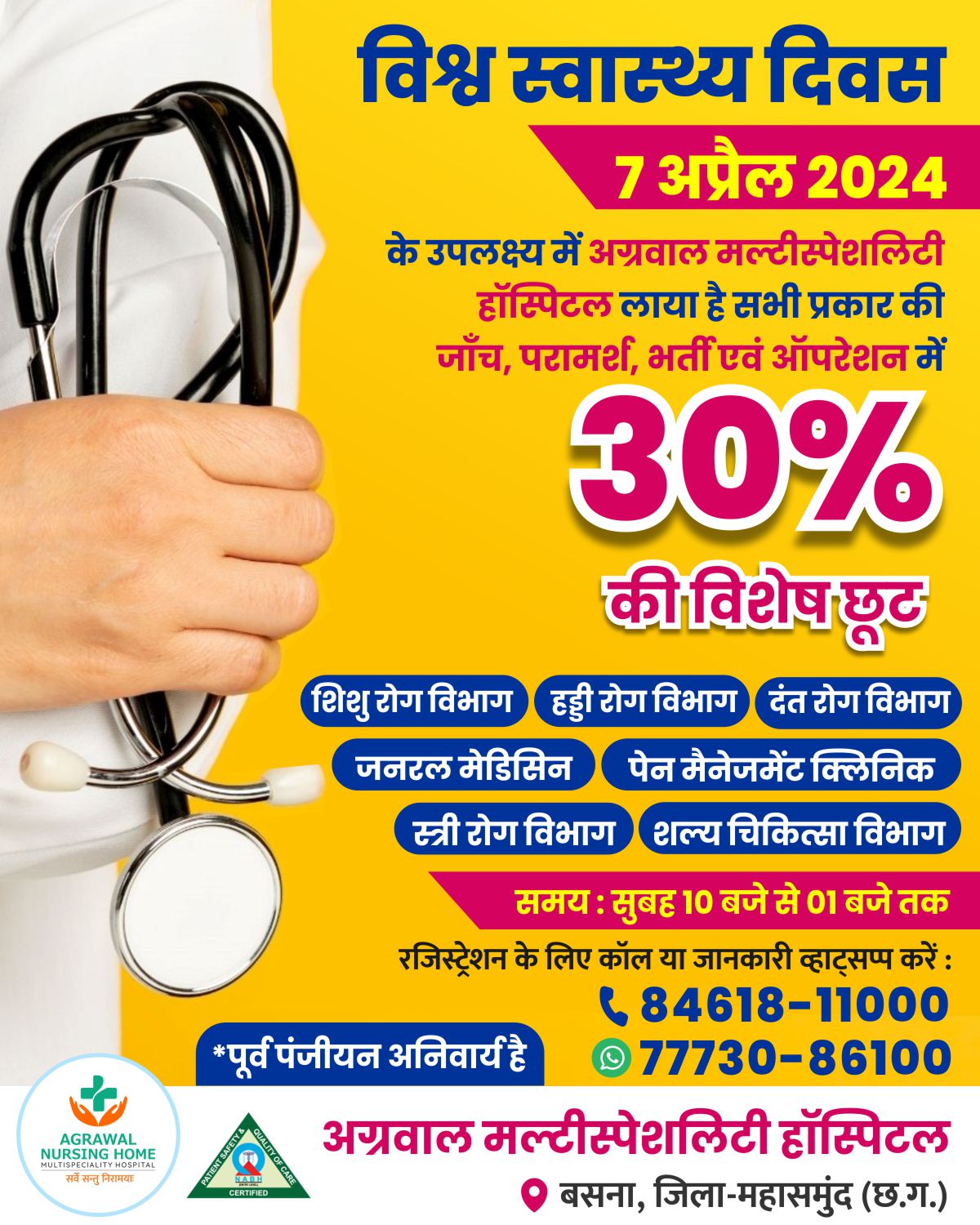 बसना : विश्व स्वास्थ्य दिवस 7 अप्रैल 2024 के उपलक्ष्य में अग्रवाल मल्टीस्पेशलिटी हॉस्पिटल लाया है सभी प्रकार की जाँच, परामर्श, भर्ती एवं ऑपरेशन में 30% की विशेष छूट