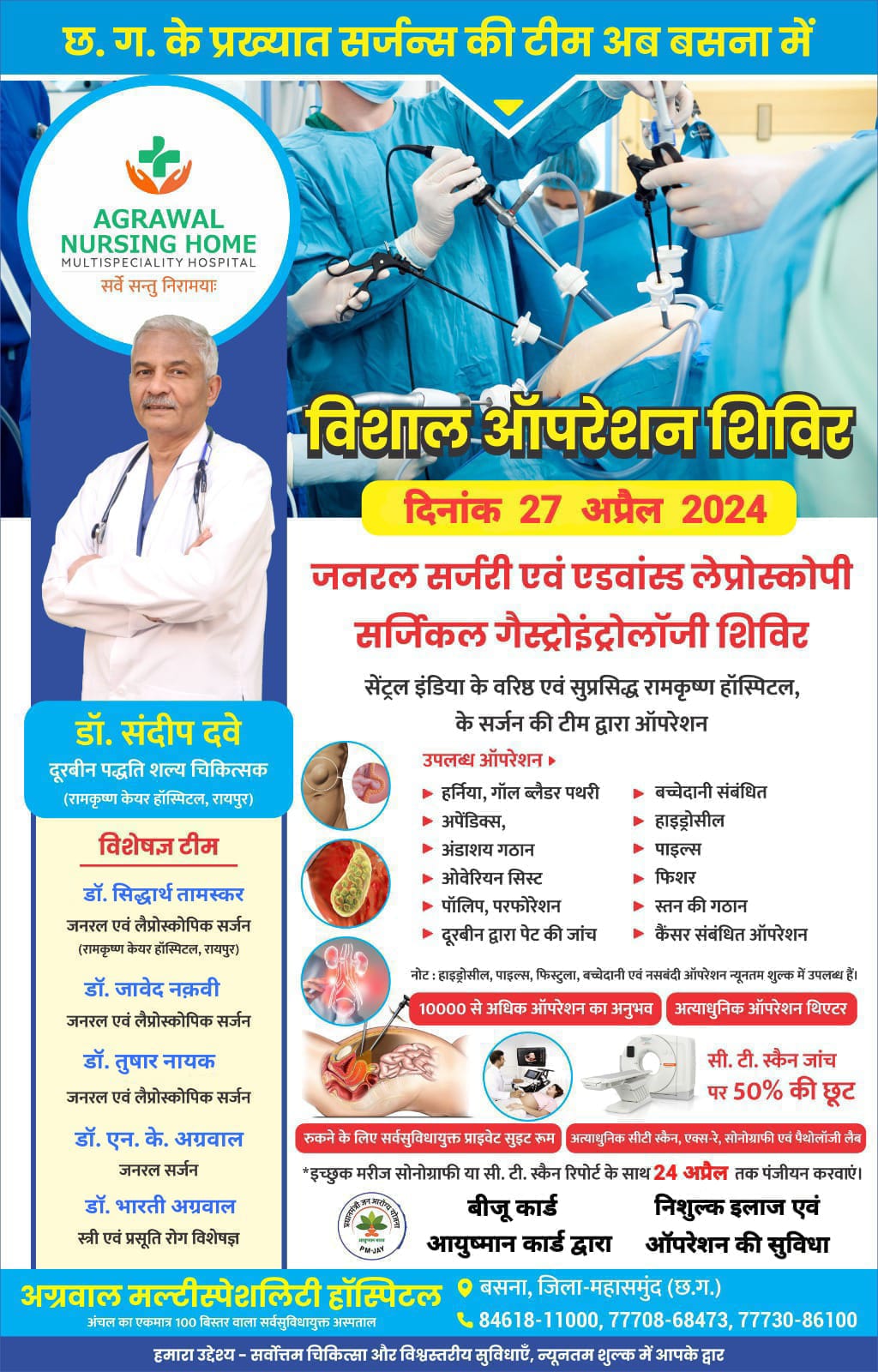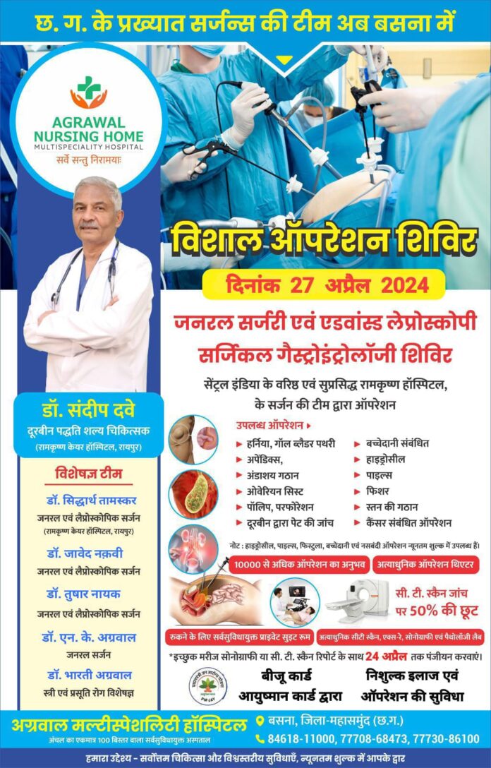 बसना : छ. ग. के प्रख्यात सर्जन्स की टीम अब अग्रवाल नर्सिंग हॉस्पिटल बसना में विशाल ऑपरेशन शिविर दिनांक 27 अप्रैल 2024 को