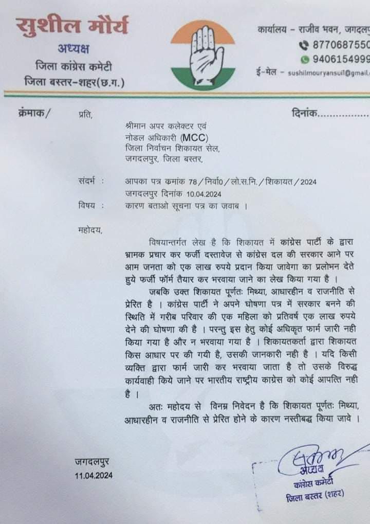 भाजपा प्रत्याशी व पूर्व संसदीय सचिव श्रीमती चौधरी ने कहा कि एक लाख रुपए सालाना देने के नाम पर कांग्रेस के लोगों द्वारा भराए जा रहे फार्म को लेकर कांग्रेस के बस्तर के अध्यक्ष ने यह माना है कि जो फॉर्म भरवाया जा रहा हैं, वह फर्जी है। बस्तर कांग्रेस अध्यक्ष मौर्य ने अपने हस्ताक्षरित पत्र में कारण बताओ नोटिस के जवाब में यह भी लिखा है कि कांग्रेस ने सरकार बनने पर एक लाख रुपए देने घोषणा की है, पर इस हेतु कोई अधिकृत फार्म जारी नहीं किया गया है और न ही भरवाया गया है। यदि किसी व्यक्ति द्वारा फार्म जारी कर भरवाया जाता है तो उसके विरुद्ध कार्रवाई किए जाने पर भारतीय राष्ट्रीय कांग्रेस को कोई आपत्ति नहीं है। श्रीमती चौधरी ने कहा कि
